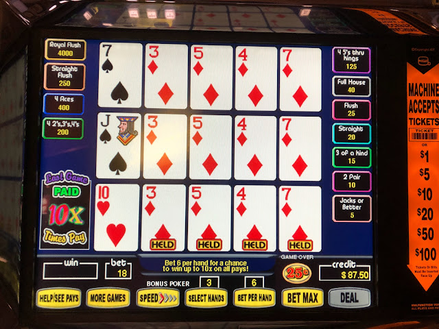 As you might have gathered, since I hit the Royal early on Day 2, I've found it really hard to connect with video poker hands. Quads have been damn scarce, and other wins almost non-existent. My biggest win on Day 2 post Royal was $40 on a slot, I think.